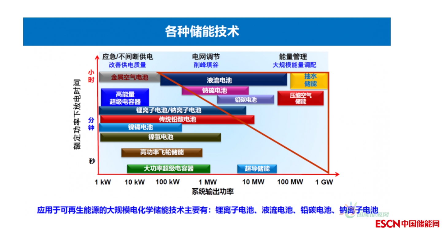 這張圖大家想必不會陌生,很多人都引用過。其中,橫坐標代表不同儲能技術系統(tǒng)輸出功率,越往右就是系統(tǒng)功率越大,縱坐標是放電時長,越往上越適合長時儲能,因此未來可以做成大規(guī)模儲能的種子選手,也就是右上角的這幾個。