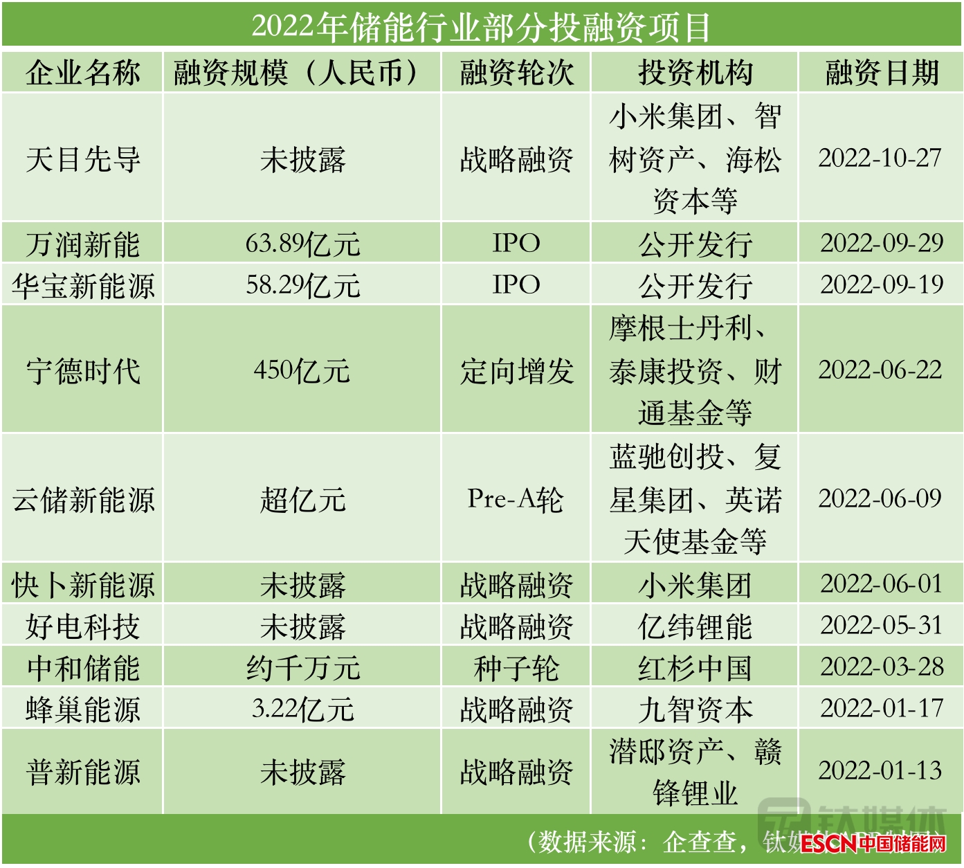 賽道一旦顯現(xiàn)熱鬧與擁擠,項目就開始遭瘋搶。鈦媒體APP從企查查獲取的數(shù)據(jù)顯示,截至11月初,國內(nèi)儲能相關(guān)產(chǎn)品合計完成150起融資事件,披露融資金額超800億元,投融資頻次及披露融資金額均已超過2020年、2021年全年,達(dá)到近5年高峰。而2020年、2021年分別合計完成融資48起、91起,披露吸金分別超300億元、600億元。