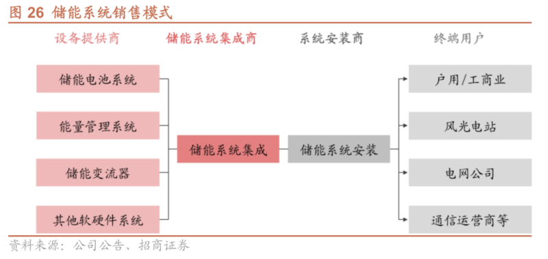 儲(chǔ)能系統(tǒng)銷售階段可分為一體模式(儲(chǔ)能電池+逆變器集成銷售)、分體模式(儲(chǔ)能電池、逆變器單獨(dú)配置),目前歐洲市場(chǎng)以分體為主。在交付系統(tǒng)安裝商后,完成終端安裝配置及調(diào)試運(yùn)行。