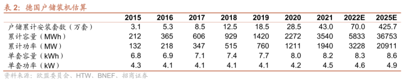 滲透率較低,潛在空間巨大。據(jù)BVES預(yù)測(cè),2022年德國(guó)戶儲(chǔ)新增安裝套數(shù)有望達(dá)到27萬(wàn)套,估算對(duì)應(yīng)裝機(jī)1.3GW/2.4GWh。目前德國(guó)住宅公寓數(shù)目大致為4000萬(wàn)套,屋頂數(shù)目約為1/4(基本穩(wěn)定,十年負(fù)荷增速低于1%),假設(shè)到2025年戶儲(chǔ)滲透率達(dá)到40%,則對(duì)應(yīng)戶儲(chǔ)安裝套數(shù)超過(guò)400萬(wàn)套,仍以5kW/8.5kWh的典型規(guī)格估算,累計(jì)裝機(jī)容量將達(dá)到21GW/36GWh。如果仍以德國(guó)占?xì)W洲50-70%的份額估算,歐洲2025年累計(jì)戶儲(chǔ)裝機(jī)容量預(yù)計(jì)在35GW/60GWh上下。