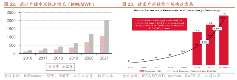 歐洲戶用光儲(chǔ)市場(chǎng)爆發(fā)。目前戶用光儲(chǔ)兼顧了投資業(yè)主(經(jīng)濟(jì)性、用能安全)和電網(wǎng)運(yùn)營(yíng)(系統(tǒng)穩(wěn)定)的多方需求,歐洲戶儲(chǔ)市場(chǎng)進(jìn)入爆發(fā)期。2021年歐洲戶儲(chǔ)裝機(jī)1GW/2GWh,同比增長(zhǎng)56%/72%,其中德國(guó)是最主要的戶儲(chǔ)市場(chǎng),占據(jù)歐洲70%以上的市場(chǎng)份額,2021年德國(guó)戶儲(chǔ)銷量約15萬(wàn)臺(tái),同比增長(zhǎng)45%,累計(jì)銷量43萬(wàn)臺(tái),2022年4月末,戶儲(chǔ)安裝量進(jìn)一步增至50萬(wàn)套上下(2.5GW/4.4GWh)。