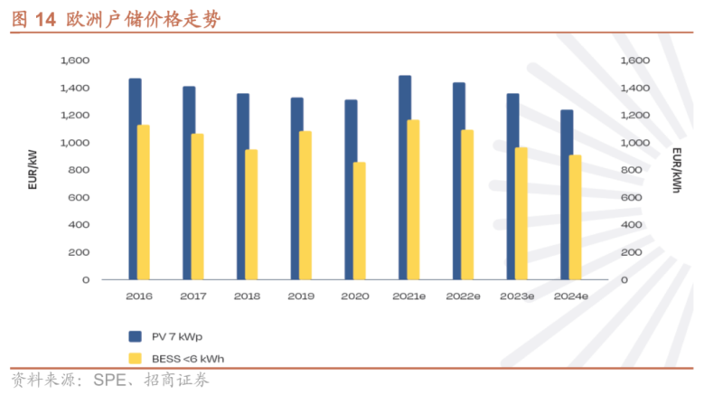 成本上,戶用光儲(chǔ)系統(tǒng)主要成本項(xiàng)目由光伏系統(tǒng)、儲(chǔ)能電池、變流設(shè)備構(gòu)成。2016-2020年間德國(guó)戶用系統(tǒng)成本下降24%,雖然在最近兩年由于供應(yīng)鏈擾動(dòng)造成了階段性的價(jià)格抬升,但預(yù)計(jì)未來(lái)整體仍將繼續(xù)下降。