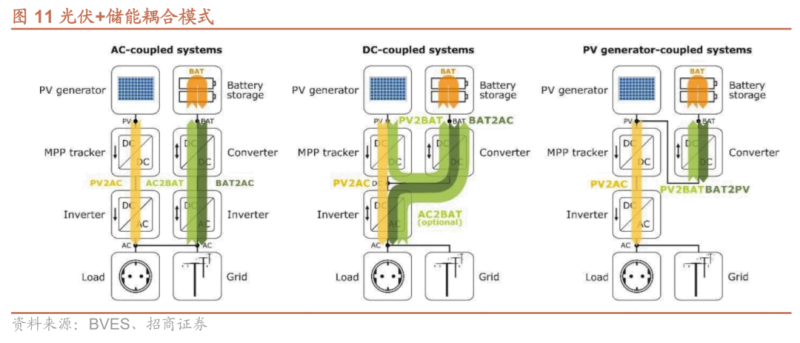 海外戶用儲(chǔ)能大部分與分布式光伏配套,光儲(chǔ)系統(tǒng)由光伏組件、儲(chǔ)能電池、逆變器/變流器構(gòu)成。參考屋頂資源及用戶負(fù)荷,通常光伏組件配置容量在5-20kW,電池蓄電容量在5-20kWh。依據(jù)電池、光伏組件耦合位置可分為共交流母線、共直流母線等結(jié)構(gòu)。