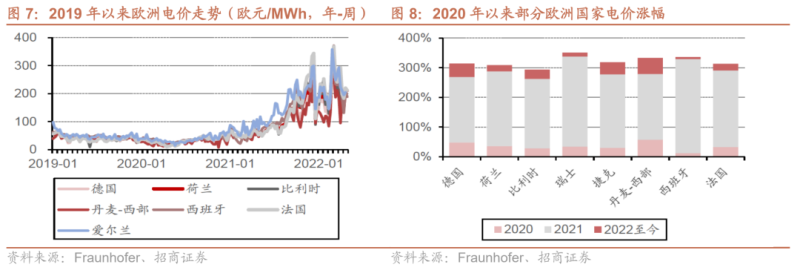 2021年疫情影響減弱后,歐洲能源需求恢復(fù),油、氣、電價(jià)就已經(jīng)進(jìn)入上行通道。2021年歐洲大部分地區(qū)天然氣價(jià)格漲幅達(dá)到400%+,電價(jià)漲幅在200-300%。