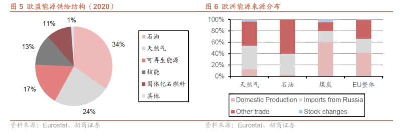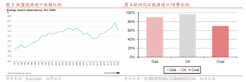 歐洲傳統(tǒng)化石能源進(jìn)口依存度偏高,并在不斷上升:1990-2019年間,歐盟能源消費(fèi)量增加0.7%(2020年下降8.1%),需求規(guī)模整體企穩(wěn),同期能源生產(chǎn)量下降22.7%(2020年下降7.1%),2020年歐盟能源進(jìn)口比例達(dá)到57%,其中天然氣、石油、煤炭消費(fèi)量中進(jìn)口比例分別達(dá)到90%、97%、70%,而俄羅斯又是歐洲能源的第一大供應(yīng)商,2020年由俄羅斯進(jìn)口能源在歐盟占比達(dá)到24.4%。