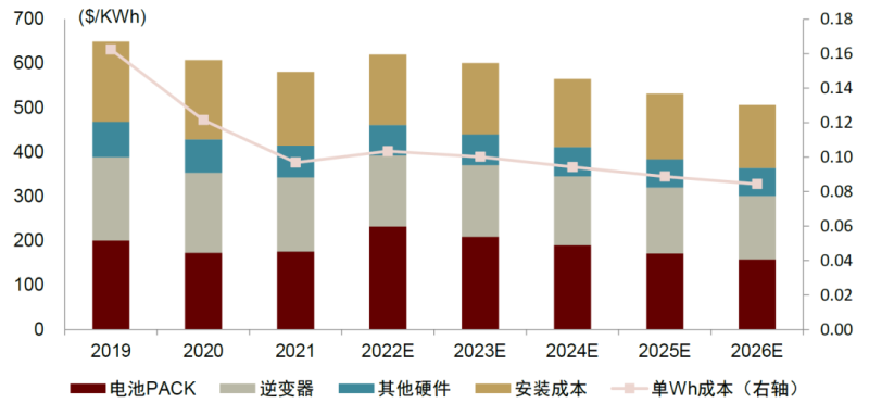 圖表28:家儲(chǔ)安裝成本拆分及LCOE預(yù)測(cè)
