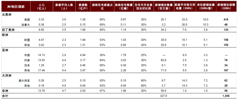 注:家儲(chǔ)在中國(guó)居民側(cè)電價(jià)機(jī)制下經(jīng)濟(jì)差、中國(guó)整縣推進(jìn)模式更適宜集中式儲(chǔ)能,故未測(cè)算中國(guó)理論市場(chǎng)規(guī)模。獨(dú)棟住宅戶占比,拉丁美洲及亞洲其他地區(qū)按照60%、其他地區(qū)按照當(dāng)?shù)貙?shí)際水平分別進(jìn)行測(cè)算;住宅可開(kāi)發(fā)屋頂光伏比例,澳大利亞按照其實(shí)際水平、其他地區(qū)按照30%分別進(jìn)行測(cè)算;單位家儲(chǔ)容量,按照各地區(qū)戶均每日用電量的50%進(jìn)行測(cè)算。資料來(lái)源:NREL,Eurostat,ISF,STATS SA,Worldometer,Statista,中金公司研究部