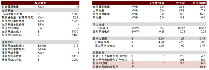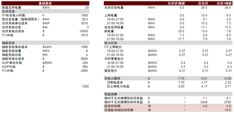 我們測(cè)算美國(guó)加州戶用光伏及儲(chǔ)能的經(jīng)濟(jì)性。我們假設(shè)無(wú)光伏/儲(chǔ)能系統(tǒng)地家庭采用單一固定電價(jià),而安裝光伏或光儲(chǔ)系統(tǒng)的家庭采用分時(shí)電價(jià),測(cè)算發(fā)現(xiàn):僅安裝光伏系統(tǒng)投資的回收期約4.6年,光伏+儲(chǔ)能系統(tǒng)投資回收期約5.9年,光儲(chǔ)系統(tǒng)中添加額外的儲(chǔ)能的投資回收期約15.5年, 光伏系統(tǒng)已存在一定經(jīng)濟(jì)性,但戶用儲(chǔ)能系統(tǒng)經(jīng)濟(jì)性尚未具備經(jīng)濟(jì)性。