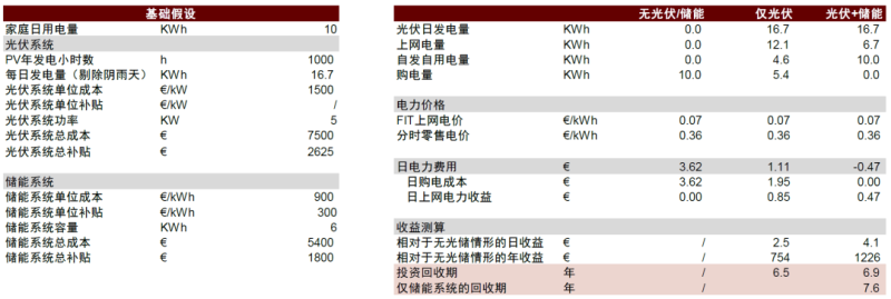 我們測(cè)算以日本東京家庭為例測(cè)算戶用光伏及儲(chǔ)能的經(jīng)濟(jì)性。我們假設(shè)無(wú)光伏/儲(chǔ)能系統(tǒng)地家庭和安裝光伏或光儲(chǔ)系統(tǒng)的家庭均采用階梯電價(jià)。測(cè)算發(fā)現(xiàn):僅安裝光伏系統(tǒng)投資的回收期約5.7年,光伏+儲(chǔ)能系統(tǒng)投資回收期約6.2年,光儲(chǔ)系統(tǒng)中添加額外的儲(chǔ)能的投資回收期約8.3年,光伏系統(tǒng)已存在一定經(jīng)濟(jì)性,而儲(chǔ)能系統(tǒng)在日本DER補(bǔ)貼及地方政府高額補(bǔ)貼下同樣具備一定經(jīng)濟(jì)性。