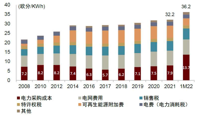 高電價(jià)驅(qū)動(dòng)戶用光伏裝機(jī)持續(xù)增長(zhǎng),同時(shí)催生儲(chǔ)能經(jīng)濟(jì)性。德國(guó)是目前歐洲居民零售電價(jià)最高的國(guó)家之一,常年維持在30歐分/KWh的水平,據(jù)SolarPower Europe測(cè)算,德國(guó)家庭安裝光伏或戶用光儲(chǔ)系統(tǒng)度電成本已遠(yuǎn)低于德國(guó)零售電價(jià)。同時(shí),2021年下半年以來(lái),能源需求增長(zhǎng)、地緣政治影響供給,歐洲天然氣價(jià)格大幅上漲并帶動(dòng)德國(guó)批發(fā)電價(jià)持續(xù)上漲,進(jìn)一步推高德國(guó)居民零售電價(jià),高居民零售電價(jià)直接驅(qū)動(dòng)戶用光伏及儲(chǔ)能裝機(jī)量。