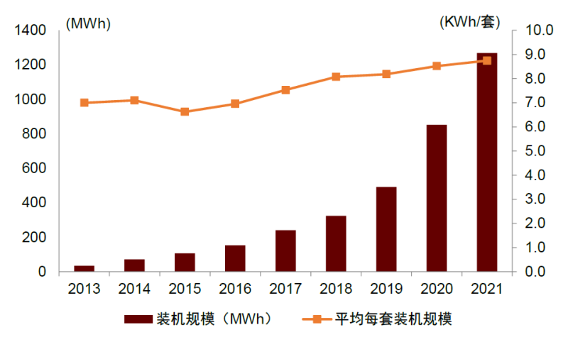 德國(guó)家儲(chǔ)裝機(jī)快速發(fā)展,占儲(chǔ)能裝機(jī)主導(dǎo)地位。根據(jù)德國(guó)亞琛工業(yè)大學(xué)相關(guān)研究數(shù)據(jù),2021年德國(guó)戶用儲(chǔ)能新增套數(shù)約14.5萬(wàn)套,對(duì)應(yīng)家儲(chǔ)裝機(jī)量約1268 MWh,同比增長(zhǎng)49%,占德國(guó)總儲(chǔ)能裝機(jī)量份額超90%。從家儲(chǔ)單套規(guī)模來(lái)看,2021年平均規(guī)模約8.7KWh,近五年持續(xù)提升。