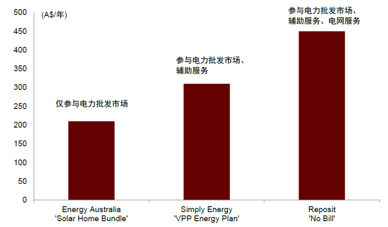 虛擬電廠提供額外收益來(lái)源。澳大利亞各州提供眾多虛擬電廠項(xiàng)目,截至2022年4月,澳洲累計(jì)虛擬電廠項(xiàng)目達(dá)61個(gè),其主要技術(shù)為表后儲(chǔ)能,而表后儲(chǔ)能又以家庭儲(chǔ)能為主。澳洲VPP項(xiàng)目通??赏ㄟ^(guò)三種方式獲取收益:1)VPP通過(guò)電力零售商進(jìn)入電力批發(fā)市場(chǎng);2)提供緊急的需求側(cè)相應(yīng)等電網(wǎng)服務(wù);3)提供輔助服務(wù)。澳洲居民可在安裝家庭光儲(chǔ)系統(tǒng)時(shí)即與系統(tǒng)零售商簽訂VPP項(xiàng)目協(xié)議以換取一定購(gòu)置折扣,或可與獨(dú)立的VPP聚合商簽訂VPP協(xié)議,將儲(chǔ)能系統(tǒng)部分容量參與VPP項(xiàng)目獲取額外收益。如新南威爾士州居民加入不同VPP項(xiàng)目可獲得約200-450澳元/年的額外利益。