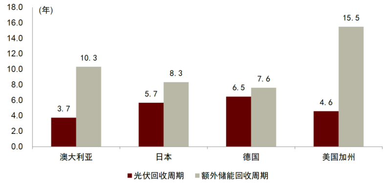 我們選取澳洲、日本、德國(guó)、美國(guó)加州四個(gè)主要家儲(chǔ)安裝地進(jìn)行經(jīng)濟(jì)性測(cè)算:日本、德國(guó)在戶用光伏基礎(chǔ)上額外增加儲(chǔ)能的投資回收期約在7-8年,已初步具備一定經(jīng)濟(jì)性,澳大利亞、美國(guó)加州在戶用光伏基礎(chǔ)上額外增加儲(chǔ)能的投資回收期均超10年,尚未具備較高經(jīng)濟(jì)性。