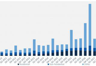 報告顯示,公共事業(yè)板塊中領(lǐng)先的是內(nèi)華達州、北卡羅來納州和德克薩斯州。其中,德克薩斯州2017年第三季度光伏裝機量比2015全年所有太陽能裝機量還多。美國東南地區(qū)光伏市場剛剛起步,佛羅里達州、密西西比州、南卡羅來納州都實現(xiàn)強勁增長,且預(yù)期2017年光伏裝機量將高于此前多有年份。根據(jù)SEIA,當(dāng)前全美處于建設(shè)當(dāng)中的公共事業(yè)規(guī)模光伏項目有4GW,GTM Research預(yù)測到年末還將增加3.9 GW。這樣一來,2017年將成為美國光伏裝機量第二大的年份,僅次于2016年。