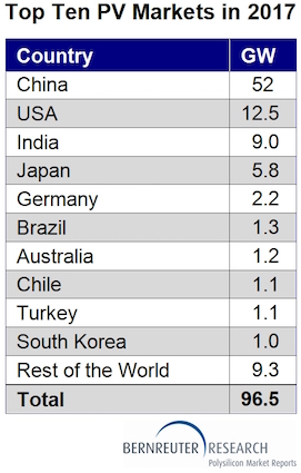Bernreuter Research的供應(yīng)側(cè)分析得到85個(gè)國(guó)家自下而上的光伏需求評(píng)估的支持,預(yù)計(jì)2017年全球安裝量為96.5GW,比2016年的超過(guò)74GW增長(zhǎng)30%。另一個(gè)指標(biāo)是同樣的方向:通過(guò)從四大模塊供應(yīng)商晶科,阿特斯,晶澳太陽(yáng)能和韓華Q電池的總體出貨指導(dǎo)中推算出全球需求,貝納特勒研究在2017年得出了類(lèi)似的結(jié)果。