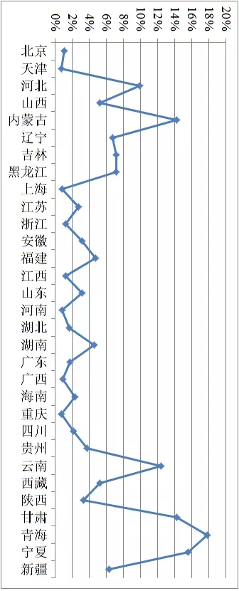 云南、內(nèi)蒙古、甘肅、寧夏、青海5省高于10%,在12.4%~17.8%之間;