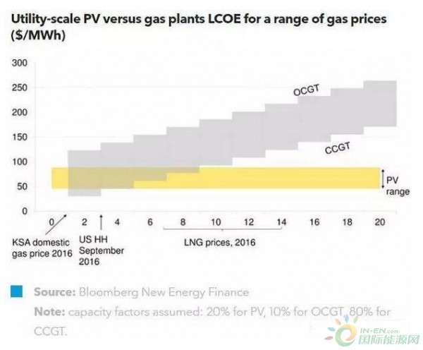 隨著光伏和風(fēng)電系統(tǒng)成本的不斷下降,再加上能源補(bǔ)貼改革的助力,MENA經(jīng)濟(jì)體必須面對一個新的可再生能源與經(jīng)濟(jì)發(fā)展環(huán)境?,F(xiàn)階段,光伏電廠的發(fā)電成本要低于天然氣進(jìn)口國內(nèi)的天然氣電廠(基本負(fù)荷運(yùn)行下的)成本。即使是在沙特阿拉伯等燃料價格補(bǔ)貼豐厚的國家,光伏仍是應(yīng)對峰值電力需求時最為經(jīng)濟(jì)的方式。