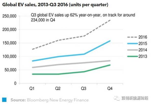 中國儲能網(wǎng)訊:2016年第三季度全球電動汽車銷量同比增長62%,其中中國和北美市場的增長最為顯著。憑借著純電動車的熱賣,中國市場的環(huán)比增長再次領先。北美同比增長則為62%,縮短了與歐洲的距離。我們認為到2016年底,電動車年度銷售量將達到70萬臺左右,交出一份出色的答卷。鋰離子電池的需求量快速上升,2016年第三季度的數(shù)字顯示,同比增長為105%。