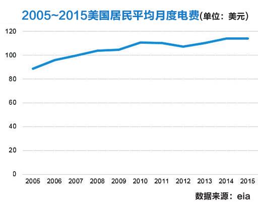 總體來看,2013年至2014年間,美國居民平均月度電費(fèi)持續(xù)攀升,2015年輕微下滑。