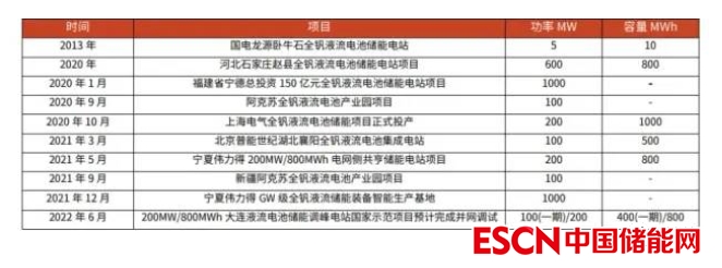 國內(nèi)全釩液流項(xiàng)目建設(shè)情況: