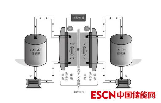 全釩液流電池(Vanadium Redox Battery,VRB),是一種活性物質(zhì)呈循環(huán)流動(dòng)液態(tài)的氧化還原電池。通過兩個(gè)不同化合價(jià)的、被隔膜隔開的釩離子之間交換電子來實(shí)現(xiàn)電能與化學(xué)能的相互轉(zhuǎn)化。釩電池充電后,正極為 V5+,負(fù)極為 V2+;放電后,正負(fù)極分別為 V4+和 V3+溶液。正極和負(fù)極之間由隔膜隔開,該隔膜只允許 H+通過,,H+也就起到了電池內(nèi)部導(dǎo)電的作用。
