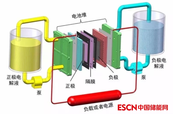 液流電池結(jié)構(gòu)。液流電池主要由電池堆(包括離子交換膜、雙極板等)、電解液、儲(chǔ)液罐、循環(huán)泵及其他結(jié)構(gòu)件構(gòu)成。電池堆內(nèi)部由離子交換膜隔絕正極電解液和負(fù)極電解液并形成兩個(gè)反應(yīng)室。電池運(yùn)作時(shí),循環(huán)泵驅(qū)動(dòng)電解液在各自反應(yīng)室中循環(huán)流動(dòng)并在各自電極附近發(fā)生氧化還原反應(yīng),通過和外界接通的雙極板形成電流。