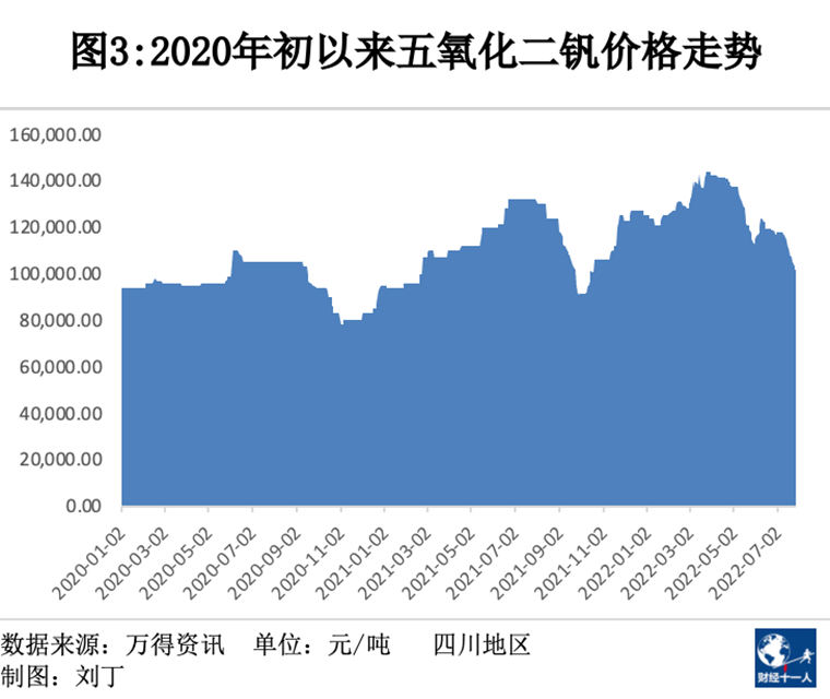 萬得數(shù)據(jù)顯示,四川地區(qū)五氧化二釩每噸價格從2020年四季度的8萬元左右,上漲到2022年4月的14萬元左右,目前仍在10萬元左右的高位。