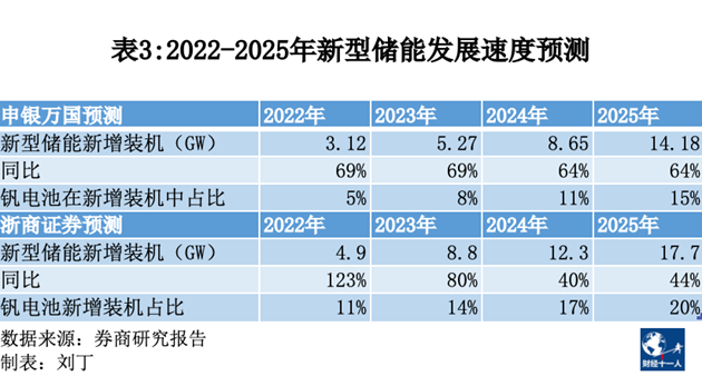 申銀萬國據(jù)此預測:2022年到2025年,中國新型儲能年新增裝機量的同比增速將分別達到69%、69%、64%、64%;浙商證券認為同比增速可達到123%、80%、40%、44%。2025年中國新型儲能年裝機量中,釩電池儲能的占比可達到15%到20%。