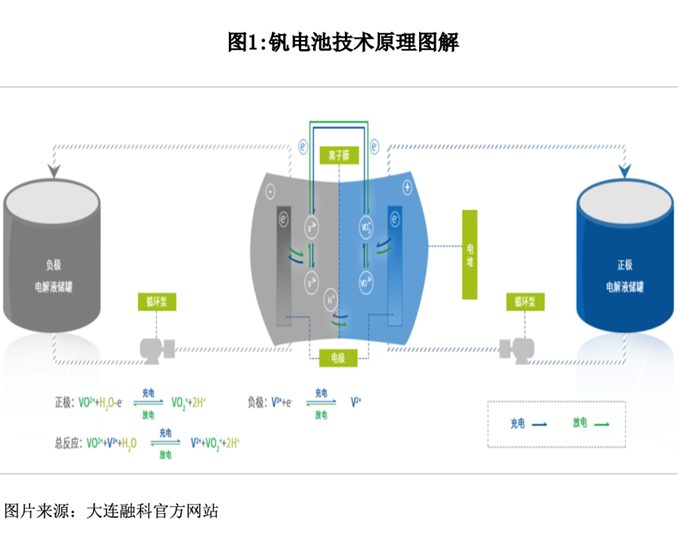 釩電池全稱是全釩氧化還原液流電池。其原理是利用釩氧化物與電極接觸發(fā)生電化學反應,使化學能轉換為電能。釩離子電解液含有化學能,釩電池儲能系統(tǒng)將其儲存在儲罐內(nèi),利用外接的泵,將電解液從儲罐壓入電池堆體內(nèi),使得電解液平行流過電極表面并發(fā)生電化學反應,從而完成釩電池儲能系統(tǒng)的充電或放電。