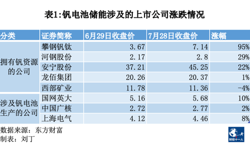 近日,釩電池概念帶動若干股票大幅波動。尤其是釩資源龍頭企業(yè)攀鋼集團釩鈦資源股份有限公司(000629.SZ,下稱攀鋼釩鈦),其股價自6月29日以來接近翻倍。