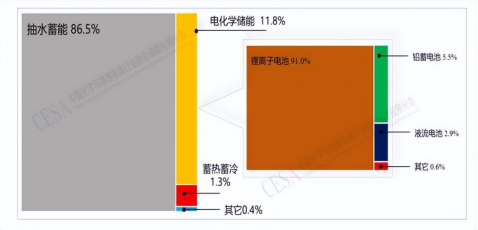 根據《2022儲能產業(yè)應用研究報告》統(tǒng)計顯示,目前中國儲能市場裝機功率43.44 GW,位居全球第一;其中抽水蓄能占有絕對主力優(yōu)勢,裝機功率在37.57GW,占比86.5%;剩下不到15%的儲能技術以電化學儲能次之,占比11.8%,后三名是蓄熱蓄冷、壓縮氣以及飛輪儲能,合計不足5%。