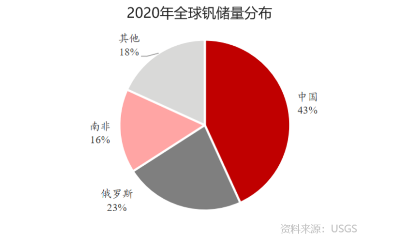 全球釩礦儲量主要集中在中國、俄羅斯、南非,中國儲量占全球的43%。根據(jù)USGS數(shù)據(jù),全球釩礦儲量共計2200萬噸(金屬量,下同),其中中國儲量950 萬噸,占比達(dá)到43%,俄羅斯和南非占比分別達(dá)到23%和16%。