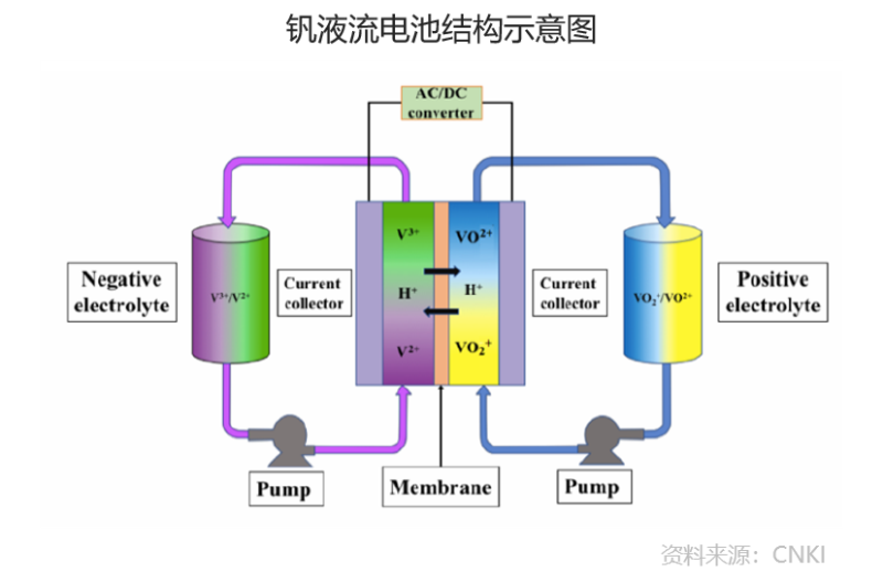釩液流電池通過釩離子的氧化還原反應(yīng)實(shí)現(xiàn)充放電功能,其原理及特性使其具備安全性高、儲能上限高、功率可自由調(diào)節(jié)、使用壽命長、自放電率低、環(huán)境友好等一系列其他儲能方式所不具備的優(yōu)勢。