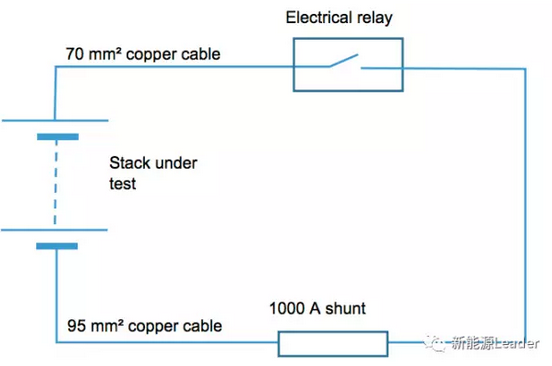 實(shí)驗(yàn)中A.H.Whitehead采用SoC為83%的液流電池電解液,正負(fù)極的電解液量都為115L。用于短路測(cè)試的電路如下圖所示,電池組分別由20和27只電池串聯(lián)組成,電池的短路電流可以通過(guò)短路器進(jìn)行測(cè)量,溫度測(cè)量則使用Pt1000熱電阻直接在電池組的外殼和正負(fù)極的極柱上進(jìn)行測(cè)量。
