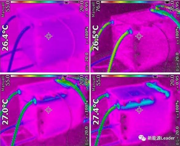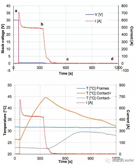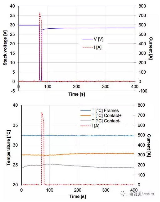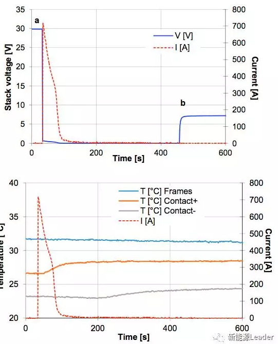 對(duì)于液流電池最危險(xiǎn)的短路情況就是,在電解液循環(huán)泵工作的情況下發(fā)生短路,并且沒(méi)有保險(xiǎn)絲的保護(hù),一般來(lái)說(shuō)這種情況容易在電池組維護(hù)的過(guò)程中發(fā)生。A.H.Whitehead利用20串電池對(duì)這種情況進(jìn)行了模擬,短路發(fā)生后電解液循環(huán)泵將繼續(xù)工作280s(一般而言,電池管理系統(tǒng)在發(fā)現(xiàn)短路后能夠在280s內(nèi)關(guān)閉電解液循環(huán)泵),測(cè)試結(jié)果如下圖所示,在短路的瞬間電池電流超過(guò)了700A,隨后短路電流下降到490A左右,并持續(xù)到電解液循環(huán)泵關(guān)閉,電池的熱成像儀圖像如下圖所示,電池溫度升高主要在正負(fù)極接線柱上,在整個(gè)測(cè)試過(guò)程中電池沒(méi)有發(fā)生泄漏、起火等。電池在短路測(cè)試后進(jìn)行的電化學(xué)測(cè)試,也表明電池性能沒(méi)有受到短路的影響。