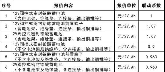 基準(zhǔn)型號(hào)產(chǎn)品“12V閥控式密封鉛酸蓄電池(含電池架、絕緣墊、連接條、輸出銅排等)”最高投標(biāo)限價(jià)為0.885元人民幣/2V.Ah(不含稅), 非基準(zhǔn)型號(hào)產(chǎn)品單價(jià)根據(jù)基準(zhǔn)型號(hào)產(chǎn)品單價(jià)乘以價(jià)格聯(lián)動(dòng)系數(shù)后保留3位小數(shù)計(jì)算得出,價(jià)格聯(lián)動(dòng)系數(shù)見下表: