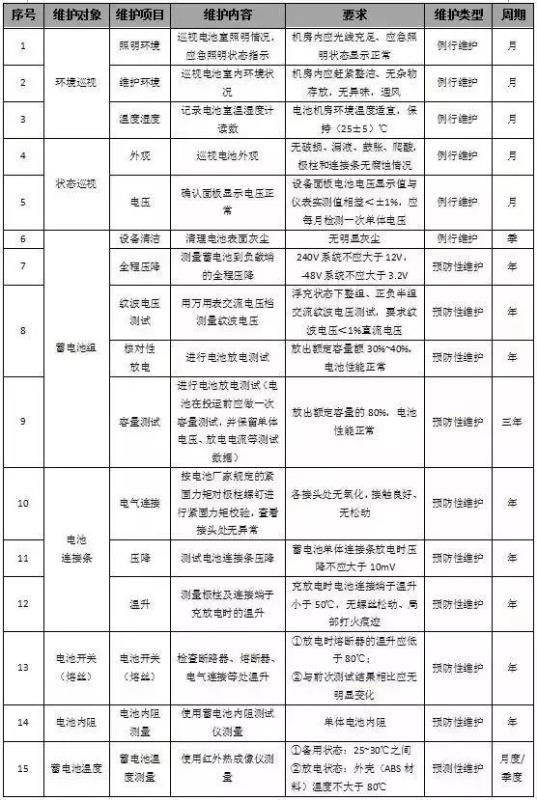如下表所示,為蓄電池組維護周期表
