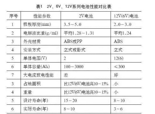 作為后備用途的VRLA電池按單體電壓等級分為2V、6V、12V等系列。按固定電解液的方式可分為AGM(超細玻璃纖維)電池和GEL(膠體)池,其對比別見表1和表2