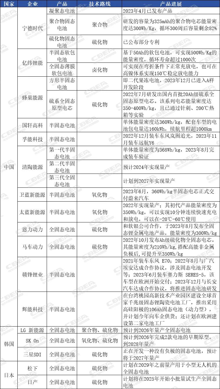 國內(nèi)企業(yè)中,億緯鋰能、蜂巢能源等企業(yè)在全固態(tài)電池研發(fā)進(jìn)度上領(lǐng)先;孚能科技、清陶能源、衛(wèi)藍(lán)新能源、贛鋒鋰業(yè)半固態(tài)電池產(chǎn)品已實(shí)現(xiàn)裝車;多家廠商半固態(tài)電池產(chǎn)品具備量產(chǎn)能力。