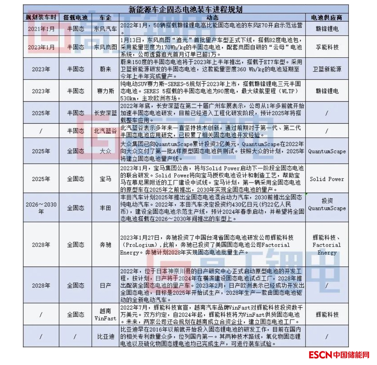 可以看出,東風(fēng)、蔚來、賽力斯已宣布將于今年實現(xiàn)半固態(tài)電池裝車,長安深藍(lán)、智己、埃安、高合等車企普遍規(guī)劃2025年前裝車半固態(tài)電池,大眾、寶馬、豐田、奔馳、日產(chǎn)、越南VinFast等品牌也計劃在2025~2030年間推出搭載全固態(tài)電池的動力汽車。