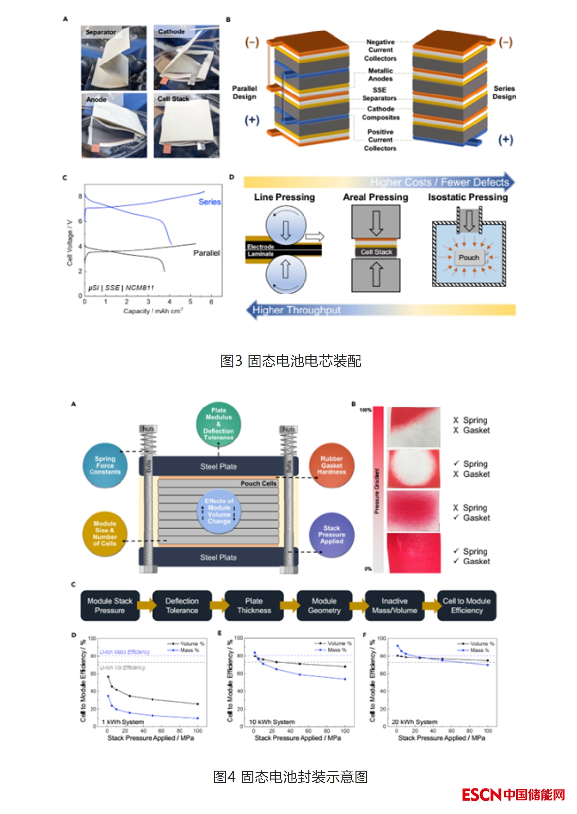 近日由LG能源公司資助的芝加哥大學(xué)的一項(xiàng)研究重點(diǎn)從全固態(tài)電池材料、電極、電芯制造等角度出發(fā),討論了固態(tài)電池規(guī)模化生產(chǎn)所面臨的挑戰(zhàn),并針對挑戰(zhàn)提出了一些潛在的解決方案。第一,材料方面的挑戰(zhàn)主要是固態(tài)電解質(zhì),根據(jù)阿貢實(shí)驗(yàn)室研究現(xiàn)階段Li6PS5Cl 價(jià)格是常規(guī)液態(tài)電解液與隔膜之和100倍。其中主要的因素是沒有規(guī)?;瘜?shí)現(xiàn)量產(chǎn),且現(xiàn)階段的合成工藝需要進(jìn)一步優(yōu)化,進(jìn)一步降低合成材料所需要的時(shí)間,如針對硫化物固態(tài)電解質(zhì)的合成,可通過固相反應(yīng)將反應(yīng)時(shí)間由48h降低至1~3h,使用非極性溶劑如二甲苯或甲苯進(jìn)行濕法球磨有助于進(jìn)一步優(yōu)化固態(tài)電解質(zhì)粒徑及其分布;關(guān)于電解質(zhì)帶來的另外一個(gè)挑戰(zhàn)主要是生產(chǎn)環(huán)境的要求,以硫化物固態(tài)電解質(zhì)為例,通常認(rèn)為對生產(chǎn)制造環(huán)境要求較為苛刻,實(shí)驗(yàn)室中一般要求在惰性氣氛下進(jìn)行,而研究表明Li6PS5Cl在-40℃露點(diǎn)下性能能夠很好的保證,實(shí)際上與常規(guī)液態(tài)電解液要求的使用環(huán)境相差并不大。第二,固態(tài)電解質(zhì)隔膜和厚電極的加工,以正極為例,如果使用硫化物固態(tài)電解質(zhì)可以使用非極性溶劑作為溶劑按照濕法電極的制作工藝進(jìn)行制備,但是濕法工藝難以滿足厚電極加工需求,通過干法電極工藝能夠有效提升厚電極的加工,采用干法電極有兩方面優(yōu)勢,一,降低溶劑使用避免了烘烤,有利于成本的降低;二,干法工藝能夠有效提升電極致密性,有利于體積能量密度的提升,同時(shí)提高了活性物質(zhì)和固態(tài)電解質(zhì)的接觸,提高鋰離子傳導(dǎo)性能。同理可以采用同樣工藝對膜或負(fù)極進(jìn)行加工。第三,單電芯的組裝,可以采用常規(guī)軟包電芯組裝方式進(jìn)行組裝,如卷繞、Z型疊片等方式進(jìn)行組裝,但對膜的強(qiáng)度要求較高,現(xiàn)階段無法完全依靠固態(tài)電解質(zhì)膜達(dá)到相應(yīng)要求,固態(tài)電池可以內(nèi)用內(nèi)部串聯(lián)的方式進(jìn)行組裝以獲取更高的能量密度。第四,電池單元的封裝,目前電池單元的封裝是全固態(tài)電池生產(chǎn)的主要限制因素,仍然需要更多的探索研究,甚至使用AI技術(shù)進(jìn)行研究。公開報(bào)道為了保障電池內(nèi)部良好的界面,采用鋰金屬電池通常組裝壓力需要達(dá)到1~7MPa,而對于硅基或者石墨類負(fù)極的全固態(tài)電池組裝壓力需要達(dá)到50-200MPa。