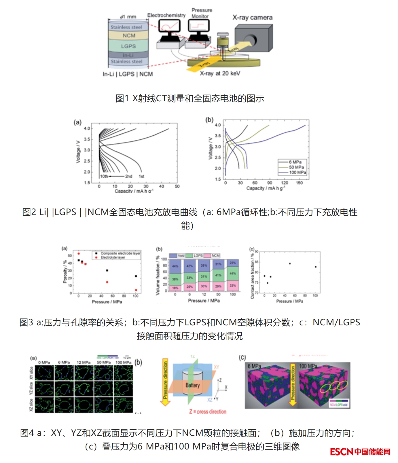 近日豐田公司研究人員及其合作者設(shè)計(jì)具體的實(shí)驗(yàn)利用X射線斷層掃描的方法分析了壓力對(duì)復(fù)合電極形態(tài)結(jié)構(gòu)和全固態(tài)電池(ASSB)電池電化學(xué)性能的影響。結(jié)果發(fā)現(xiàn):(1)增加壓力會(huì)降低電極的孔隙率,有效提高活性材料(AM)與固體電解質(zhì)(SE)之間的接觸面積。降低孔隙率、提升接觸面積會(huì)顯著影響電極的表觀電導(dǎo)率;(2)AM和SE之間接觸面積的提升使得電極中電荷轉(zhuǎn)移電阻降低了一個(gè)數(shù)量級(jí);(3)外部施加壓力使得電池充電/放電容量有效增加,表明正極材料電化學(xué)活性得到有效提升,根據(jù)實(shí)驗(yàn)數(shù)據(jù)隨壓力增加電池充放電容量呈現(xiàn)出指數(shù)級(jí)別的增加。通過對(duì)實(shí)驗(yàn)結(jié)果進(jìn)行分析認(rèn)為盡管表觀電導(dǎo)率的提高和電荷轉(zhuǎn)移電阻的降低,都有利于提升電池的電化學(xué)性能,但電荷轉(zhuǎn)移電阻降低的效果尤為明顯。AM和SE之間的接觸界面略微垂直于施加的壓力。同時(shí)實(shí)驗(yàn)發(fā)現(xiàn)通過垂直于AM和SE接觸面的方向?qū)嵤毫?,即使外部?shí)施較低的壓力也能達(dá)到較為理想的效果。
