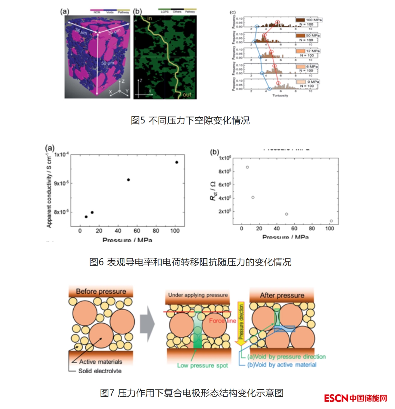 常規(guī)的做法是在電極制造的過程中施加一定的壓力,來克服固態(tài)粉末之間的固-固接觸。在電極制造過程中,盡管施加高壓改善了粉末之間的固-固接觸,但后續(xù)在電池充放電反應(yīng)復(fù)合電極不同材料的體積變化,會(huì)導(dǎo)致活性物質(zhì)和固態(tài)電解質(zhì)之間接觸不良,因此在充放電過程中同樣需要一定壓力用以克服帶來的問題。根據(jù)相關(guān)文獻(xiàn)一般需要施加的壓力為1MPa,遠(yuǎn)低于電極制造過程中的百M(fèi)Pa,壓力參數(shù)直接影響復(fù)合電極中的空隙率,并改變表觀離子電導(dǎo)率。