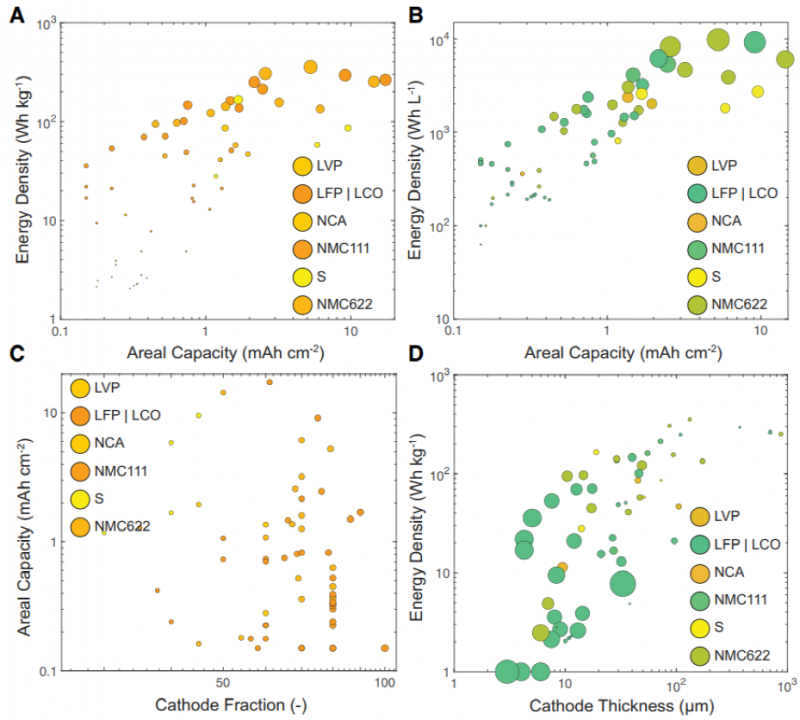 如圖5所示,SolidPAC可用于相關(guān)實(shí)驗(yàn)參數(shù)的計(jì)算與預(yù)測(cè),如陰極厚度、過(guò)量陽(yáng)極含量、重量和體積能量密度(圖5)。圖5A和5B所示,重量和體積能量密度隨陰極面積容量的增加而增加,但與陰極化學(xué)無(wú)關(guān)。由于較大的SE厚度和低面積容量,大多數(shù)SSB的性能遠(yuǎn)遠(yuǎn)低于最新報(bào)道的鋰離子電池性能。然而,應(yīng)注意的是,與體積能量密度相比,重量能量密度顯示出更大的度量偏差。這是因?yàn)椴煌螤畹腟SB(扣式電池、壓力電池、Swagelok電池),具有不一樣的電池體積,這樣會(huì)導(dǎo)致更大的質(zhì)量能量密度偏差。此外,圖5C所示,活性材料的比重和面積容量之間的相關(guān)性也顯示出不均勻分布,表明在給定的復(fù)合陰極配方中,陰極面積負(fù)載(mg cm-2)和厚度(mm)的數(shù)值范圍通常都比較大。圖5D所示,可以清楚地觀察到,在較低的過(guò)量陽(yáng)極和較高的陰極厚度,可以獲得較高的能量密度。
