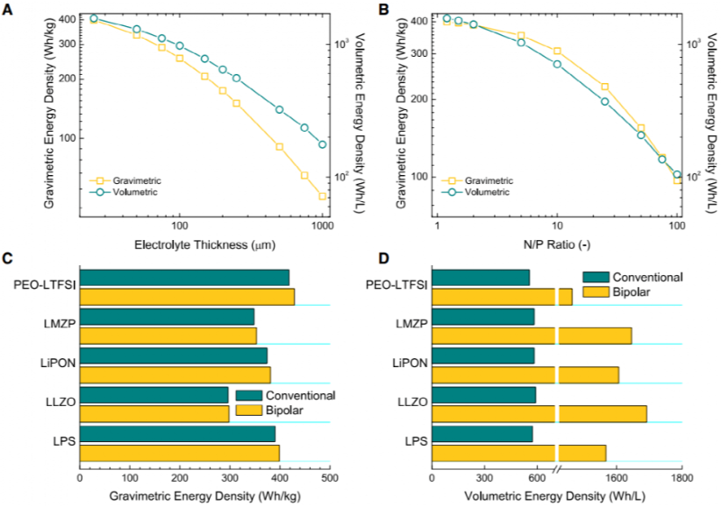 與傳統(tǒng)堆疊相比,雙極堆疊適用于SSB,因?yàn)镾E可降低電解液泄漏和電池短路的風(fēng)險(xiǎn)。因此,陰極和陽(yáng)極可以涂覆在同一個(gè)電池的兩側(cè),無(wú)需對(duì)單個(gè)電池進(jìn)行單獨(dú)包裝和密封。由于減少了外部布線和集電器接線片,降低了電池的歐姆電阻,減少了封裝材料的使用,從而提高了雙極堆疊SSB的功率和能量密度。針對(duì)圖2C和2D所示的一系列化學(xué)反應(yīng),研究人員評(píng)估了堆疊結(jié)構(gòu)對(duì)電池級(jí)能量密度的影響。