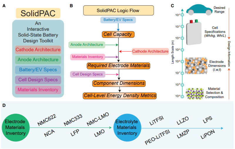 作為新一代具有高能量和高功率密度特征的固態(tài)電池,在可充電電池領(lǐng)域具有很好的應(yīng)用前景。而確定新興電池能否滿足實(shí)際應(yīng)用,達(dá)到與傳統(tǒng)鋰離子電池相當(dāng)?shù)男阅?,能量密度這一性能指標(biāo)至關(guān)重要。然而,現(xiàn)有的技術(shù)仍然無(wú)法全面的評(píng)估電池設(shè)計(jì)、電池組件與固態(tài)電池能量密度之間的內(nèi)在關(guān)系?;诖?,美國(guó)橡樹(shù)嶺國(guó)家實(shí)驗(yàn)室Ilias Belharouak等人介紹了一種可用于固態(tài)電池性能全面分析的交互式實(shí)驗(yàn)工具包(SolidPAC)。該工具包可根據(jù)用戶特定的應(yīng)用要求,設(shè)計(jì)出相應(yīng)的固態(tài)電池,幫助研究人員對(duì)電極材料性能和組分、電極厚度和負(fù)載、成本等因素進(jìn)行合理優(yōu)化,并利用逆向工程概念,將電池能量密度輸出與材料和電池設(shè)計(jì)輸入有效地關(guān)聯(lián)起來(lái)。