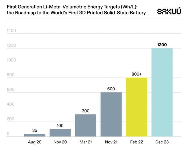 Sakuu稱,這一成就是實現(xiàn)在2023年制備超過1,200Wh/L的全3D打印固態(tài)電池(SSB)目標前的重要一步,所含有的能量密度遠遠高于當今市場領先的鋰電池。(目前市場常見的鋰電池的能量密度在500-700Wh/L范圍內。)