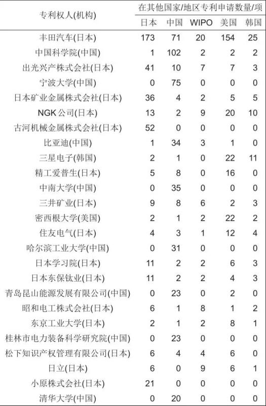 表3 全固態(tài)鋰電池技術(shù)專利權(quán)人(機(jī)構(gòu))及其專利申請時(shí)間分布情況