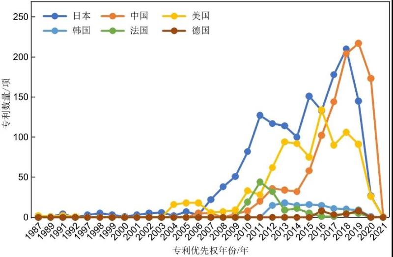 圖7 全球全固態(tài)鋰電池技術(shù)主要優(yōu)先權(quán)國家或地區(qū)發(fā)展趨勢