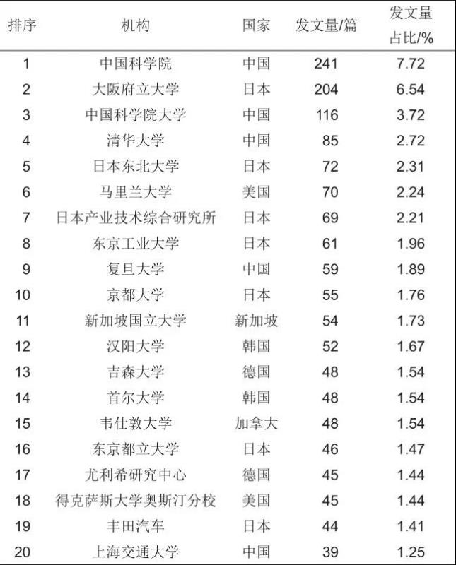 表1 全固態(tài)鋰電池技術(shù)領(lǐng)域發(fā)文量前二十機(jī)構(gòu)情況
